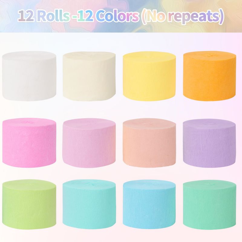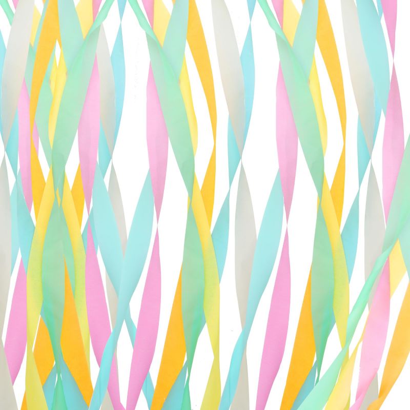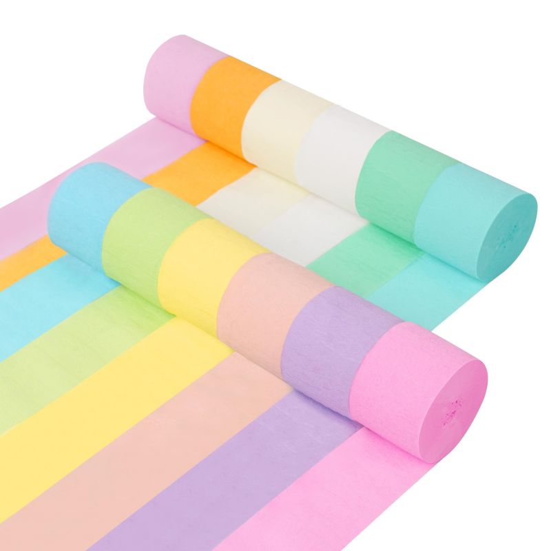 - Size And Color: The width of each roll of pastel streamers is 1.77 inches and the length is 82 feet. The 12 colors are light pink, light purple, peach, light yellow, light green, light blue, sky blue, mint green, white, ivory, light orange, water pink.