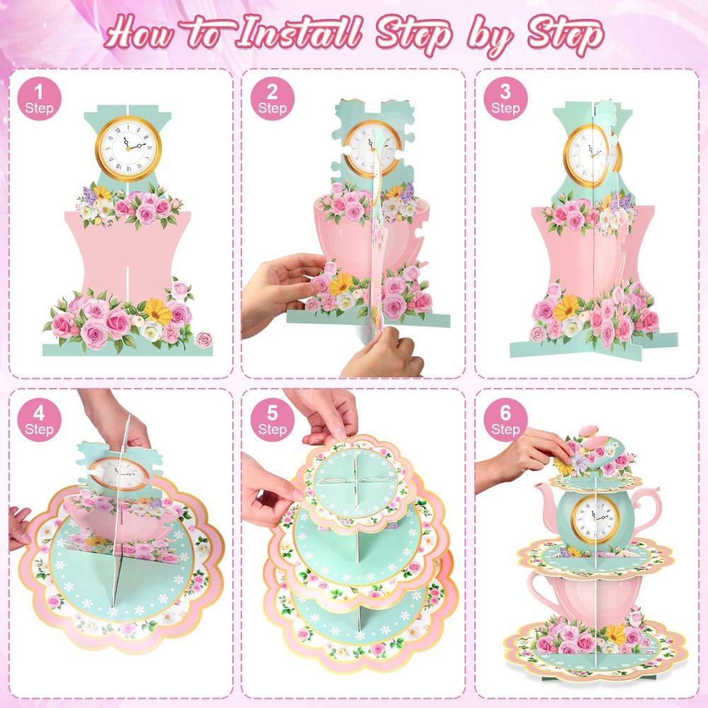 - Easy to Use: Easy to Use: our floral tea party dessert tower decorations are not need to use any tools during assembly, you can refer to the assembly steps in the picture, thick cardboard is fixed between every two layers of cake stands, the groove cut matches the cardboard cut, easy to disassemble and store to save space
