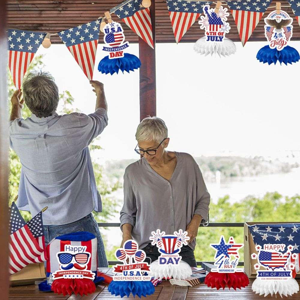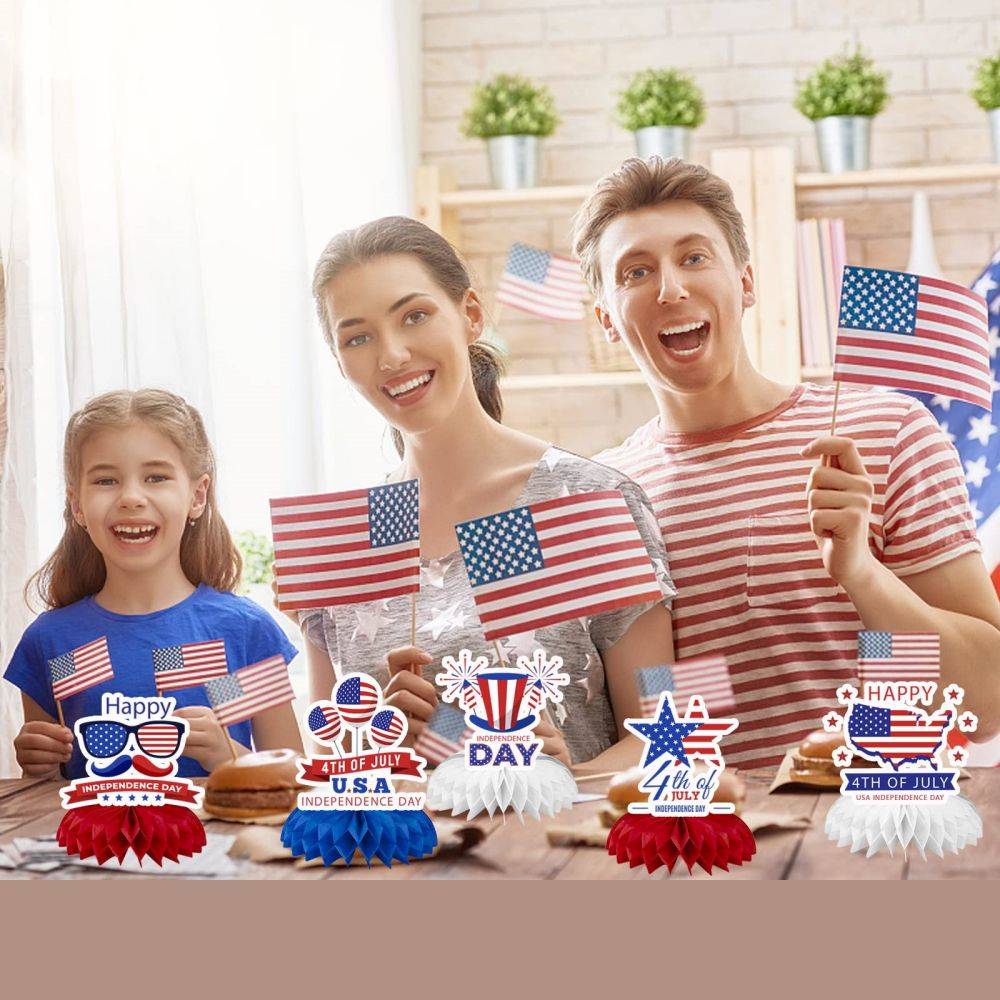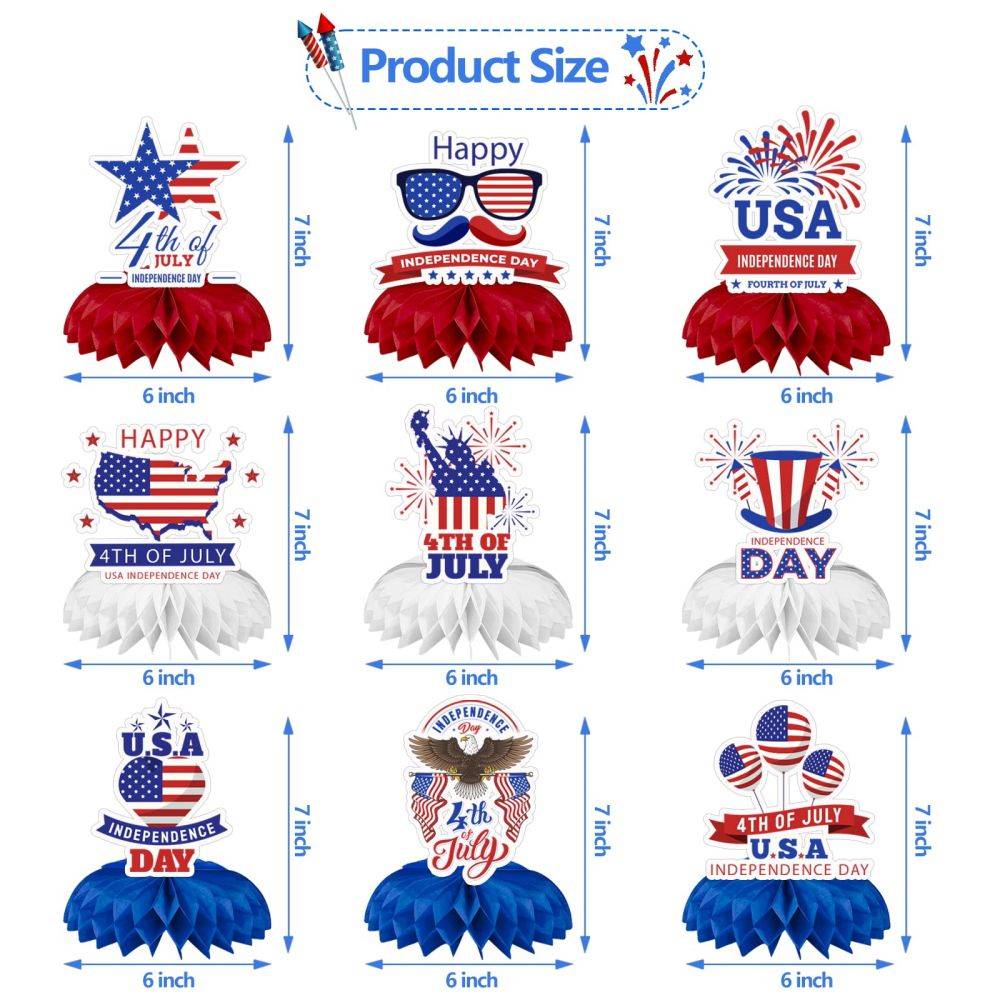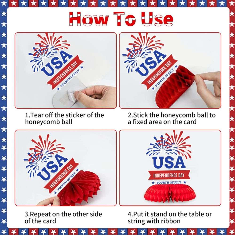 - [Reliable Materials]: Patriotic theme centerpieces table decorations are made of thick cards, lightweight and sturdy. Just tear off the sticker on the back of the honeycomb ball, unfold the honeycomb and paste on the Independence Day themed card, a cool honeycomb decoration is done!