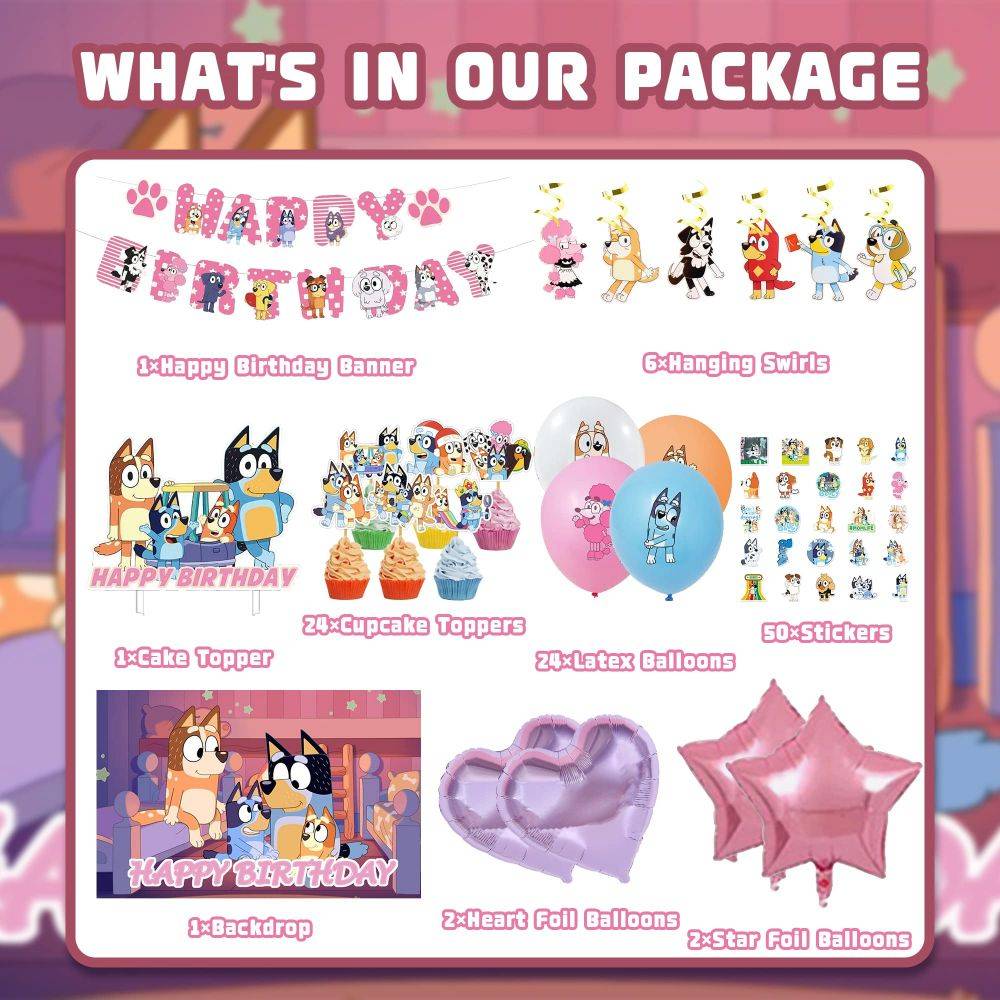 - Package Includes: 1 happy birthday banner, 6 hanging swirls, 1 cake topper, 24 cupcake toppers, 1 backdrop, 24 latex balloons, 2 heart foil balloons, 2 star foil balloons, 50 stickers.