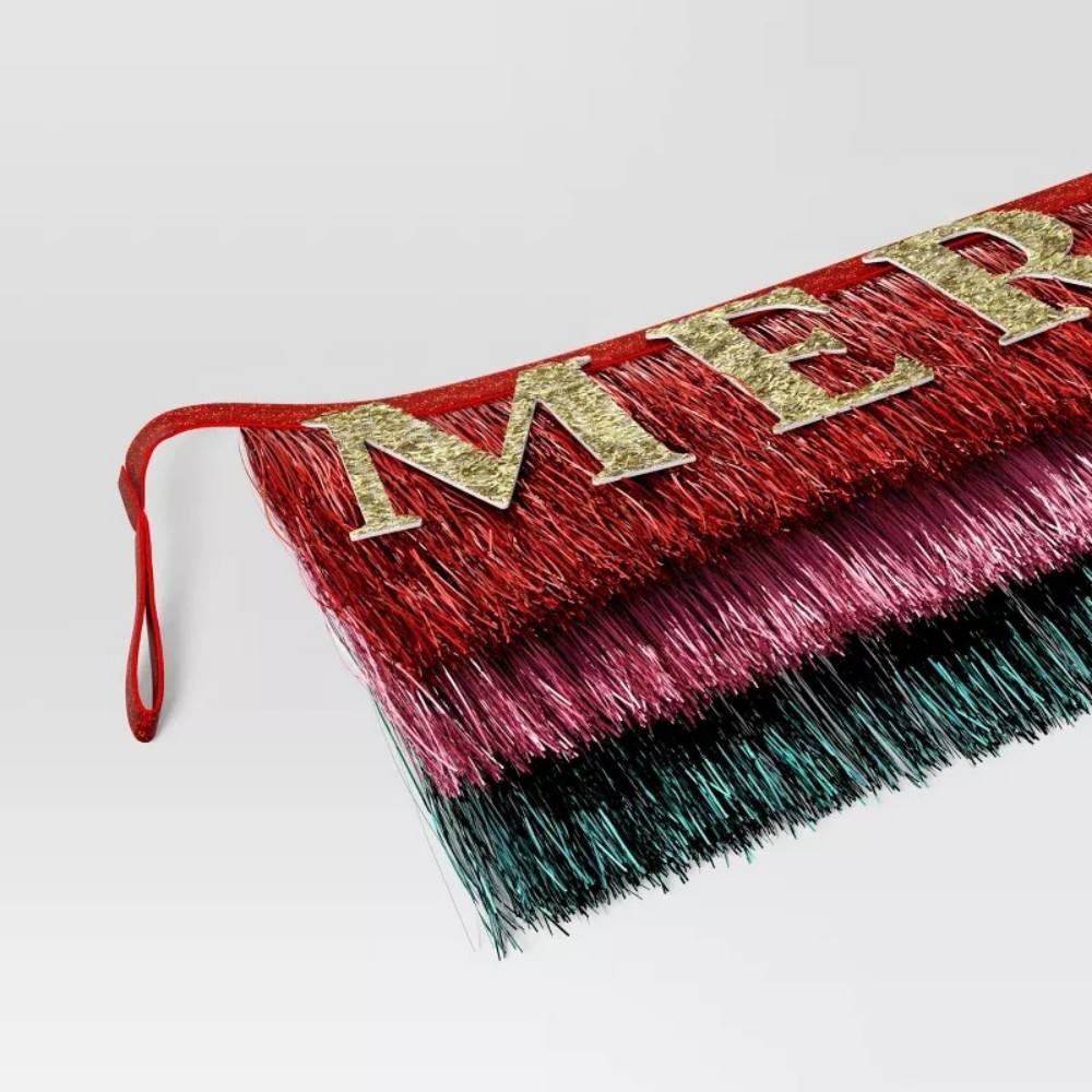 Red and green colored garland with gold colored letters spelling _MERRY CHRISTMAS._