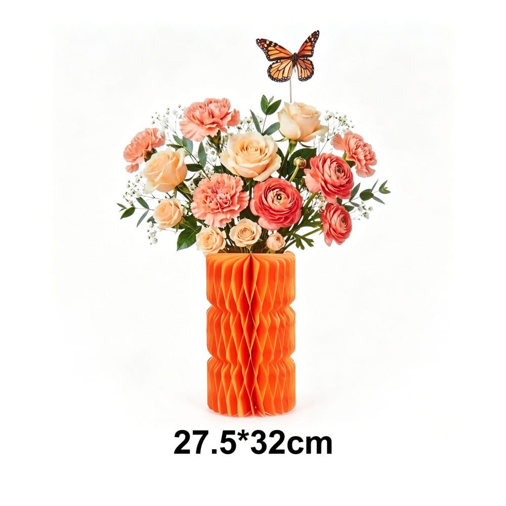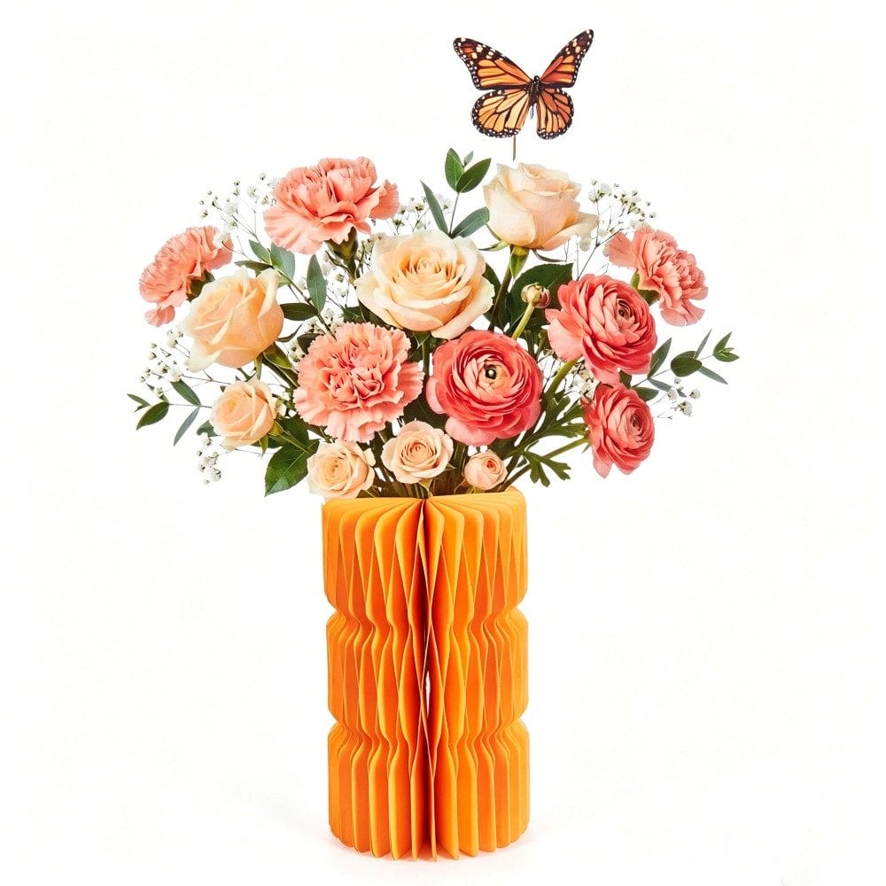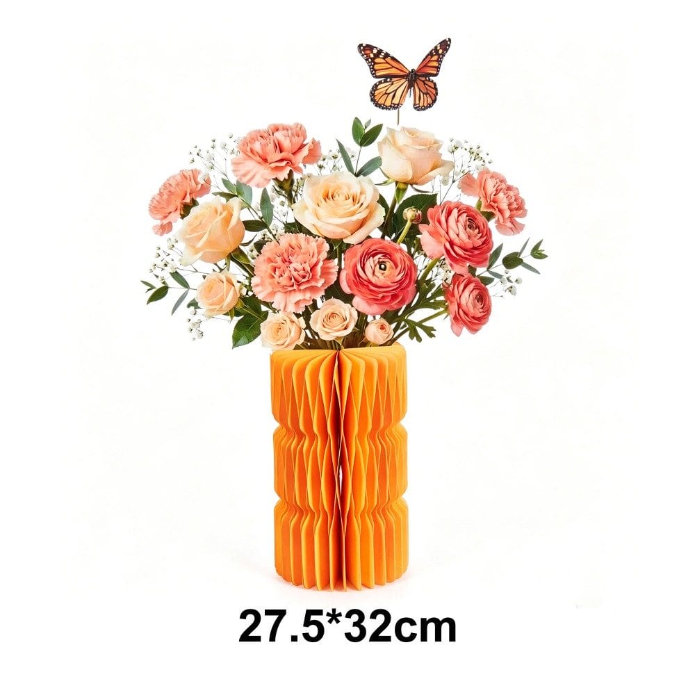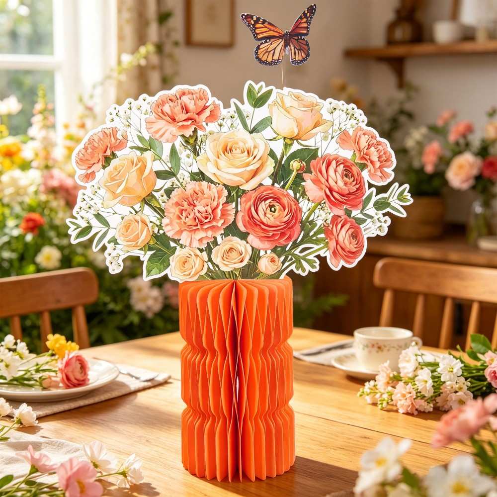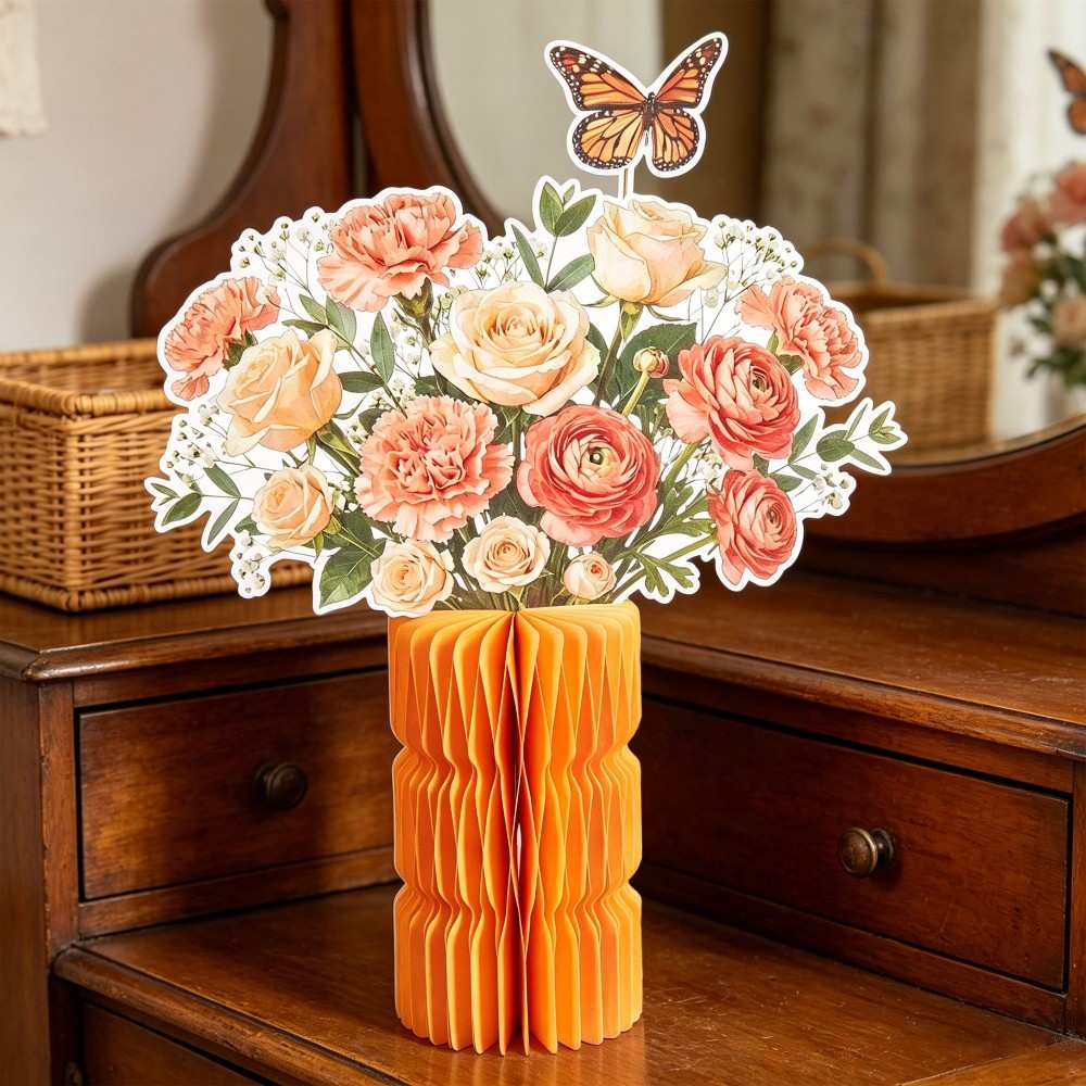 All-in-One Pop-Up Design: Includes a vibrant orange origami vase and detailed paper flower bouquet (roses, carnations, baby’s breath) with a butterfly accent, ready to display straight out of the box.