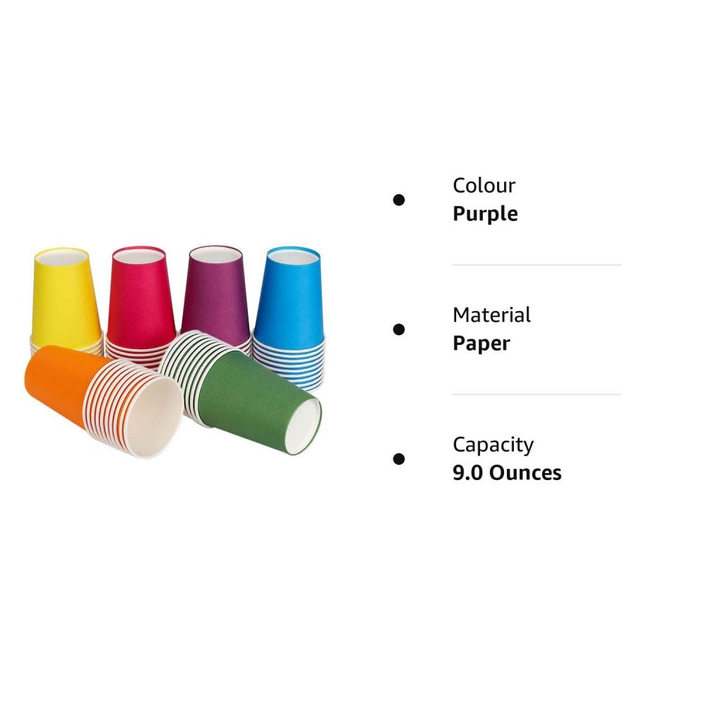 - Coloured Paper Cups Set: Each pack contains 60pcs 9oz paper party cups measuring 7.5 * 5 * 8.5cm. 6 colours: red, orange, blue, green, purple and yellow, 10 of each colour. So party paper cups can be used for general parties and DIY needs