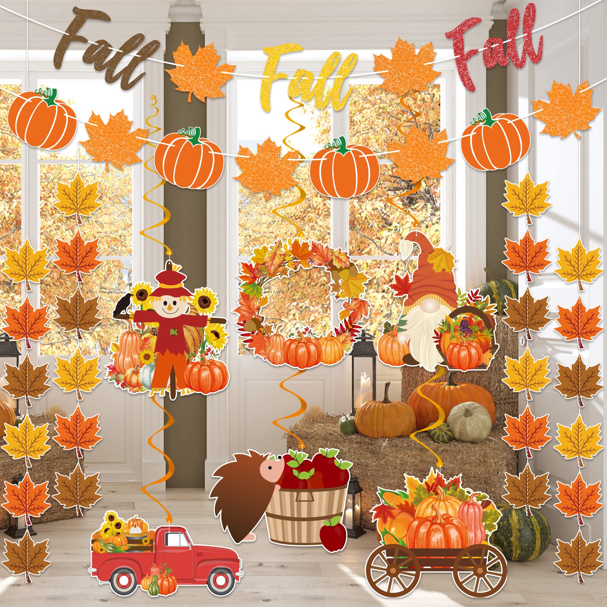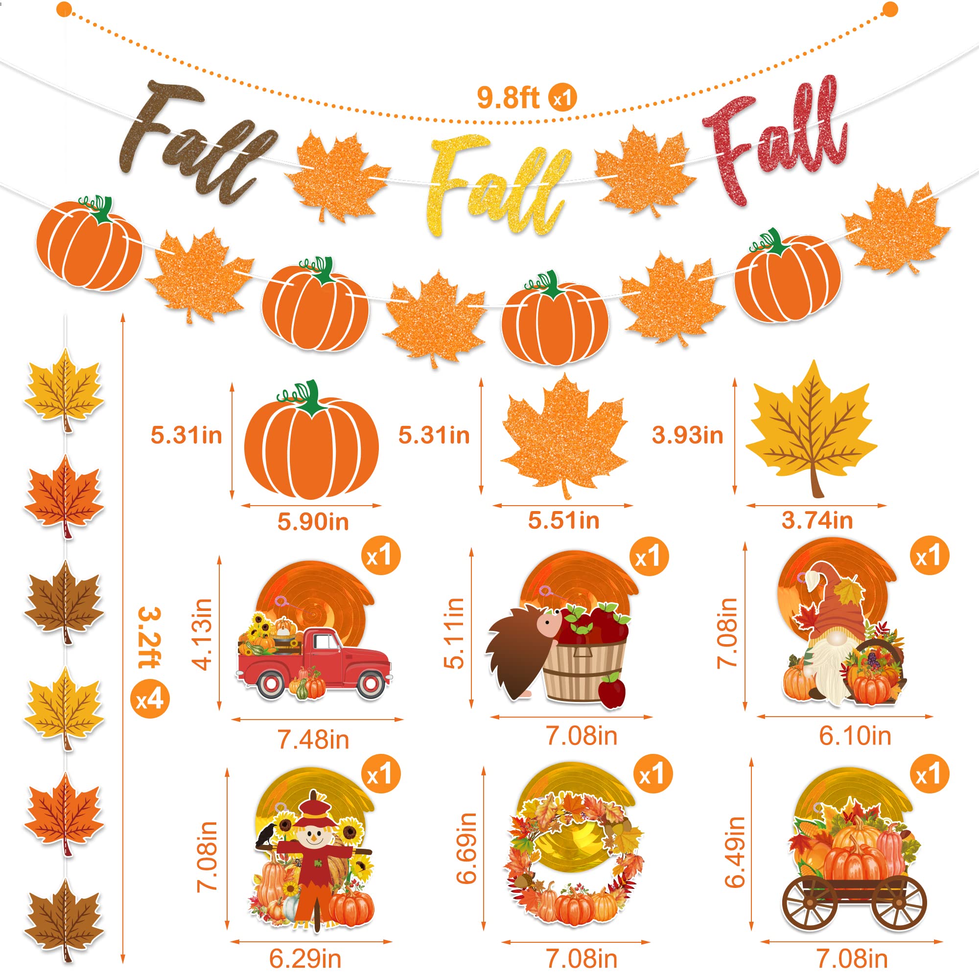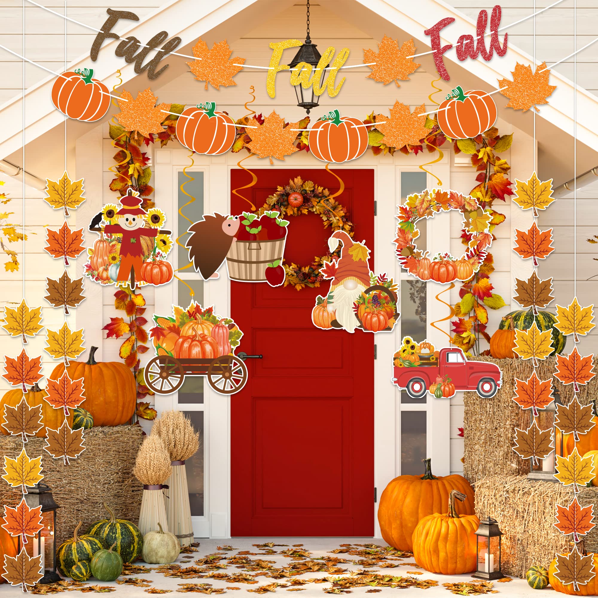 • [ What You Will Get ] In this fall decoraiton set, you will receive 6pcs double-sign printed hanging swirls, 1pcs glitter fall banner garlands, 1pcs glitter fall pumpkin maple leaves garland and 4pcs maple leaves garland strings.