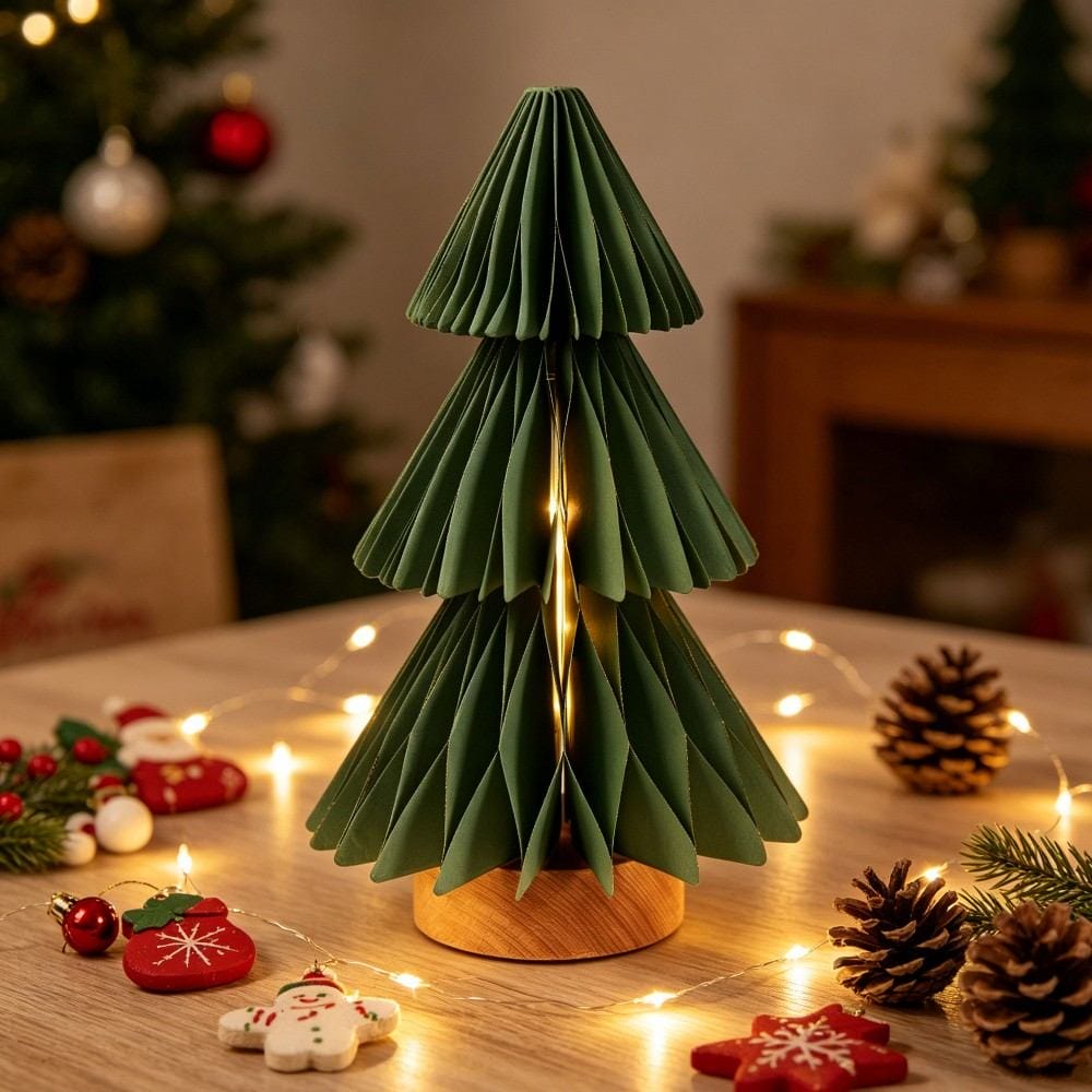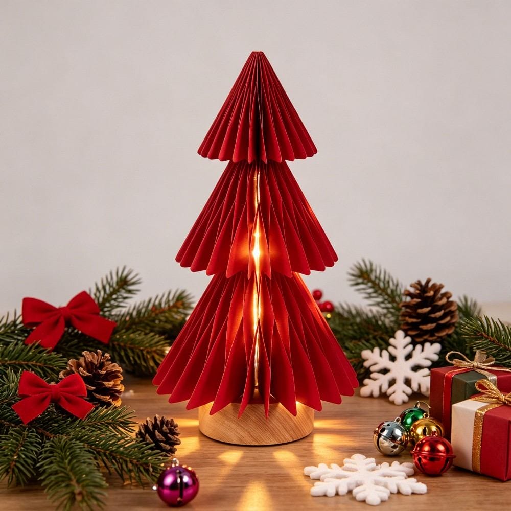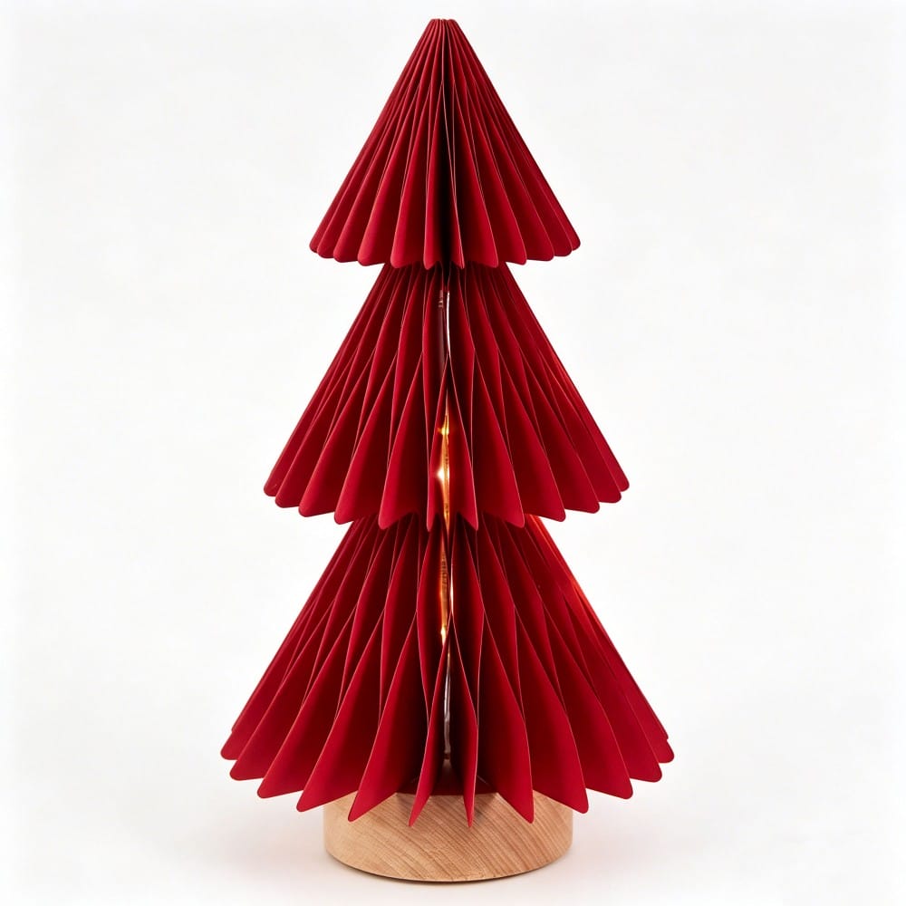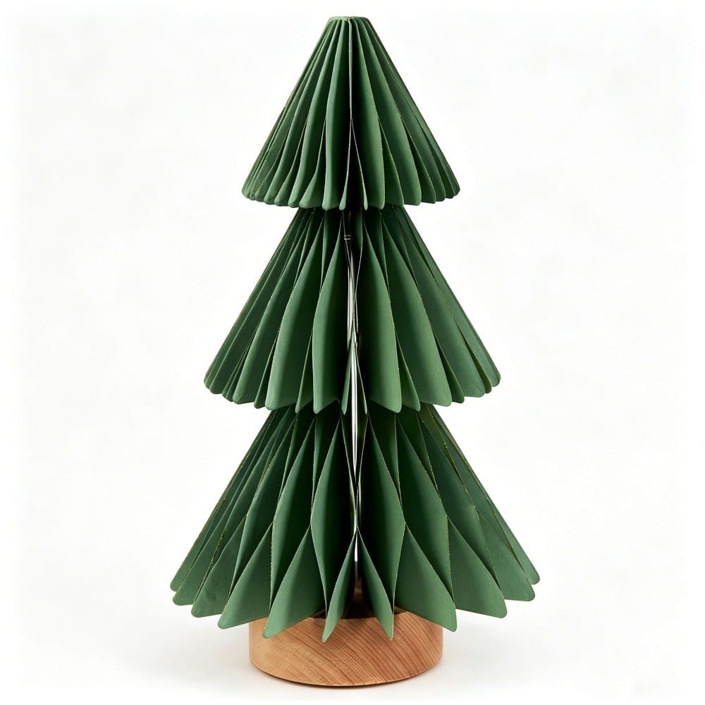 3-Tier Pleated Christmas Tree Design: Crisp origami-style pleated paper forms a dimensional evergreen silhouette, creating a warm, festive glow for holiday decor.