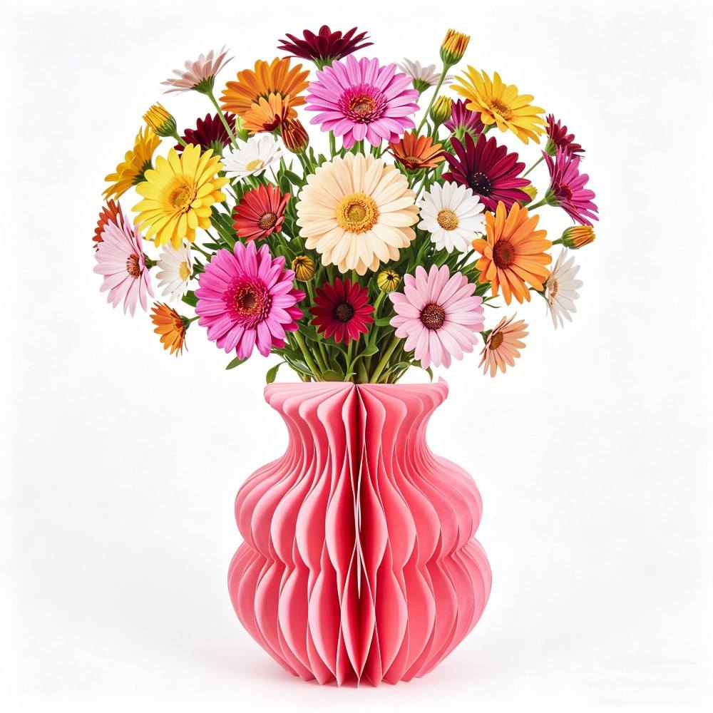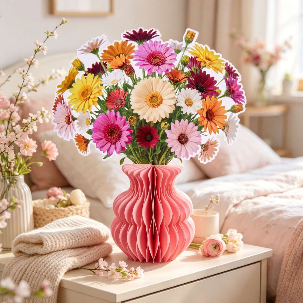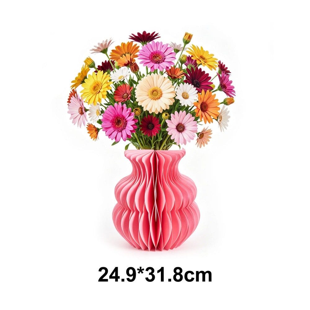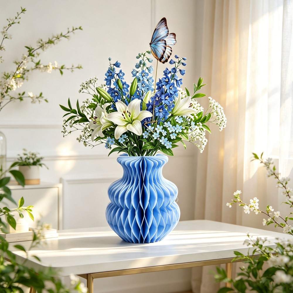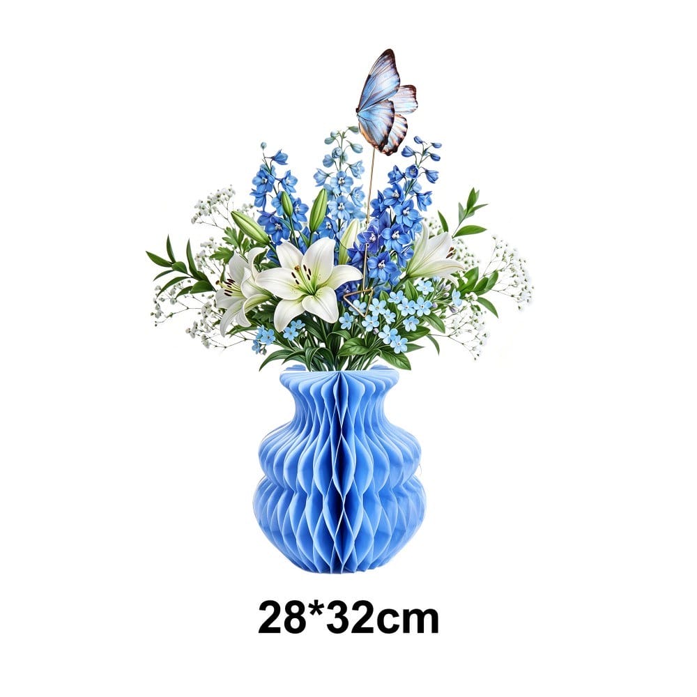 All-in-One Pop-Up Design: Includes an origami pleated vase and detailed paper flower bouquet (blue lily/delphinium mix or colorful gerbera daisy mix) with butterfly accents, ready to display straight out of the box.