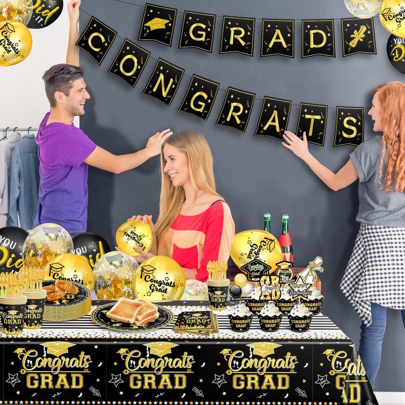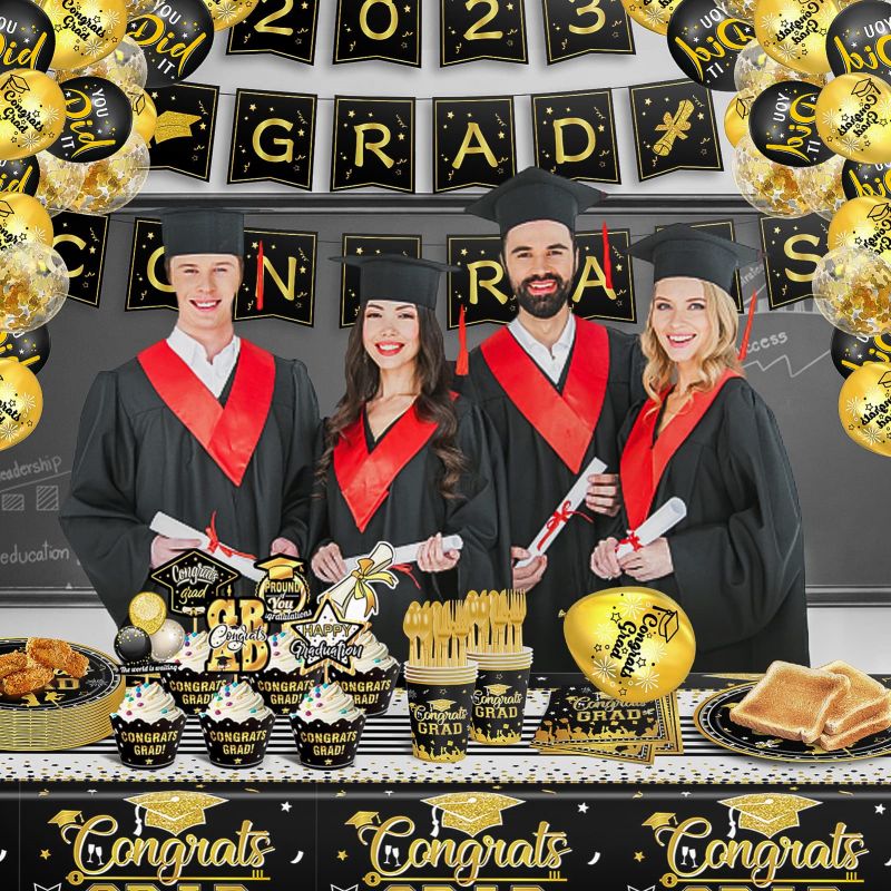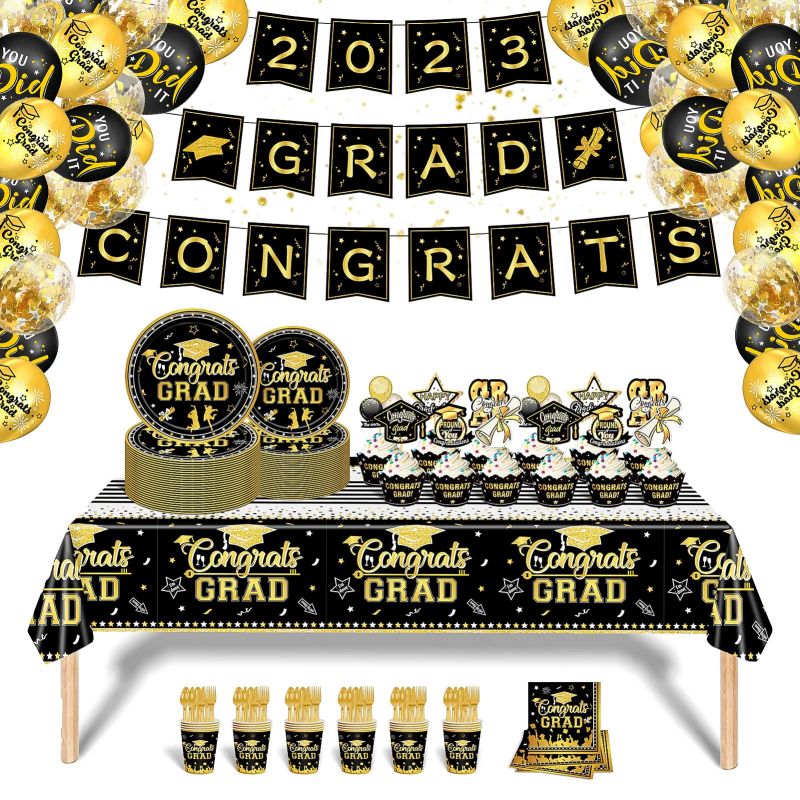 Graduation Party Decorations 2023 and Disposable Dinnerware(Serve 24) Include Black and Gold Plates, Napkins, Cups ,balloons, Banner, Tablecloth, Cupcake Toppers (Black and Gold)