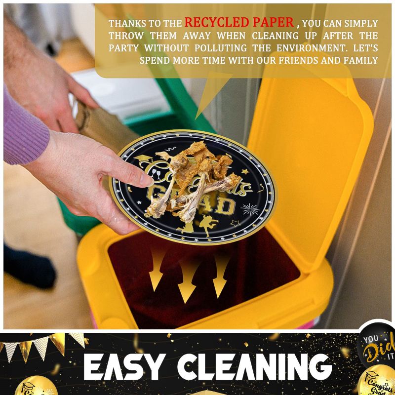 - Graduation Party Supplies: Graduation party tableware is a pattern with gold stars, dots, graduation caps and other graduation elements on a black background. elegant and nice to match well with your decoration and to impress your guests.
