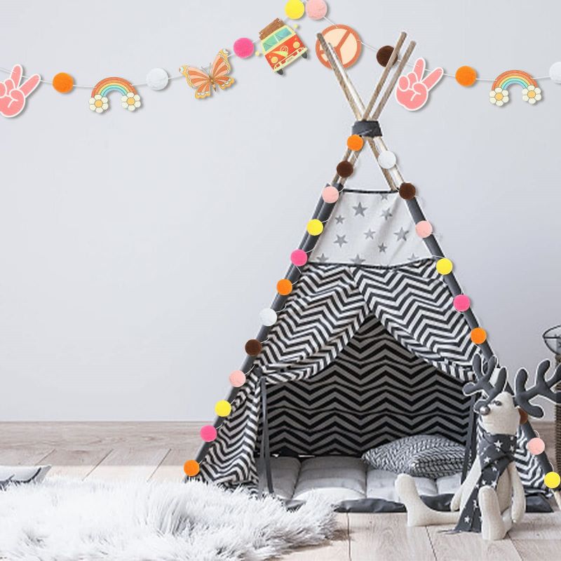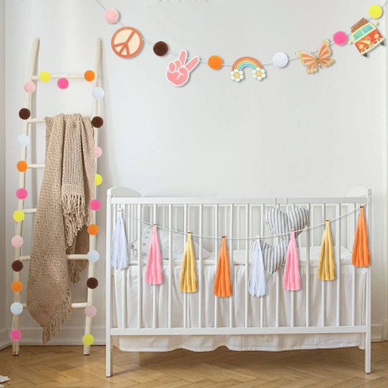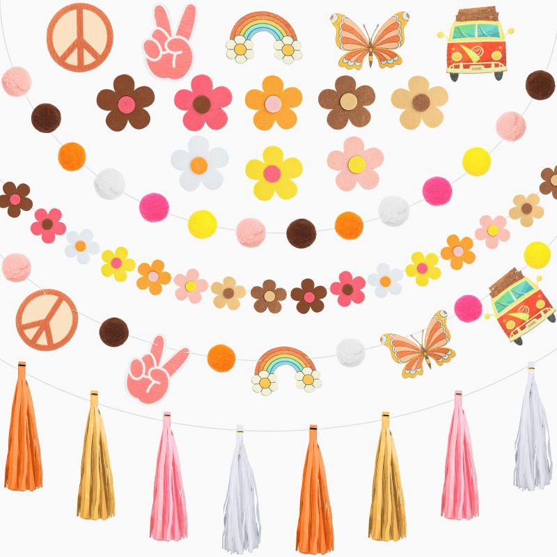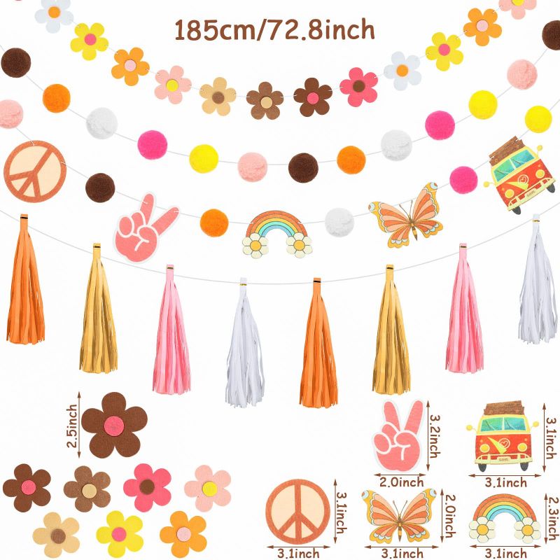 The groovy party decoration shas delicate patterns such as daisy, felt pom pom garland, rainbow, retro bus, butterfly,,victory gesture sign, a variety of patterns and styles are cute but not monotonous, creating a vibrant atmosphere for your spring or party.