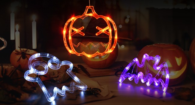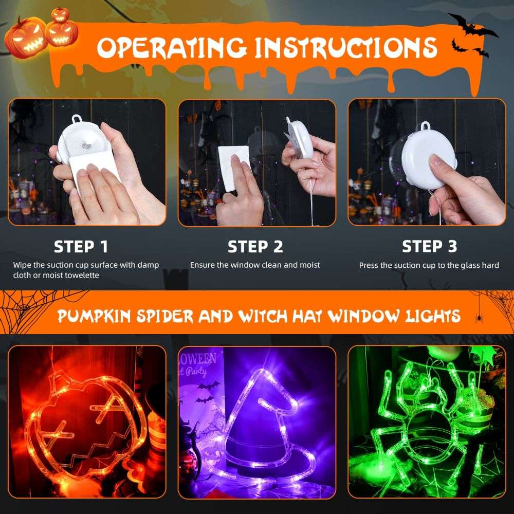You will get a set of 4 spooky Halloween window lights, designed in the unique shapes of White Ghost, orange pumpkins, green spiders and purple witches’ hats, highlighting the Halloween theme, each with suction cups and hooks to add a spooky and whimsical vibe to the decor, giving your decor a more fun feel. Whether it’s a bedroom, window, wall, door, balcony, porch or cabinet, these lights will an extra touch of spookiness to your Halloween ambiance.